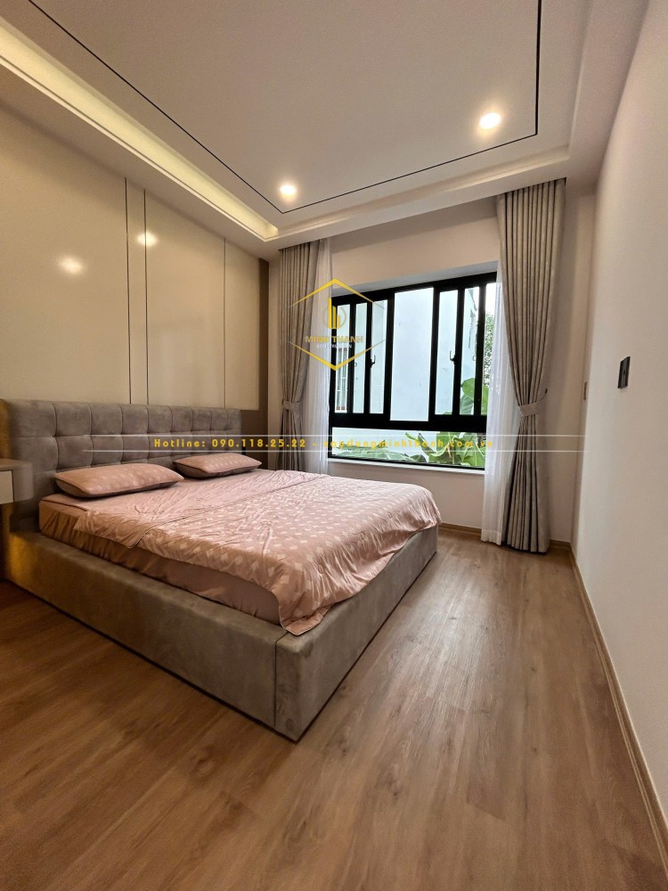 • Tiện ích: Tủ quần áo âm tường và vách đầu giường được thi công tỉ mỉ, tối ưu hóa công năng sử dụng.
