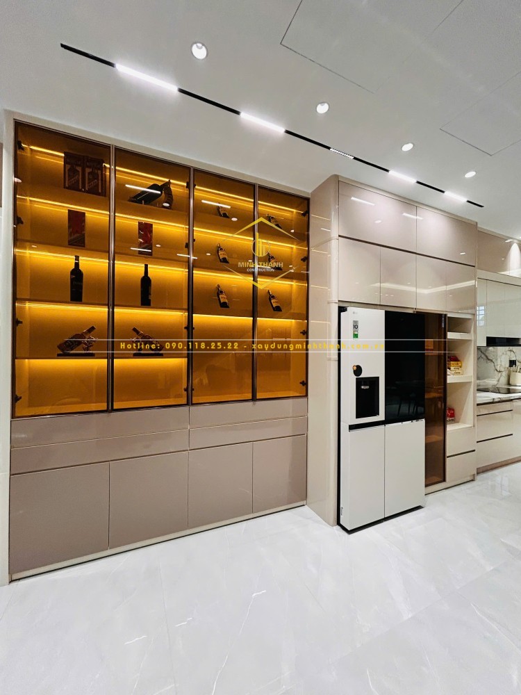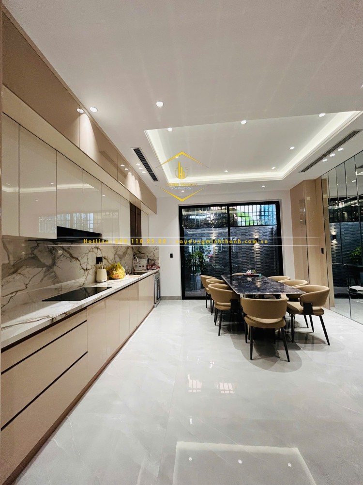 Nhà bếp được thiết kế theo dạng chữ I tối ưu diện tích với hệ tủ cánh phẳng bóng gương (Acrylic). Mặt bếp và bàn ăn đều sử dụng đá marble đen vân trắng đối lập, mang lại cảm giác sạch sẽ và đẳng cấp. Hệ thống đèn LED âm trần và đèn ray trượt giúp không gian luôn tràn ngập ánh sáng ấm áp.