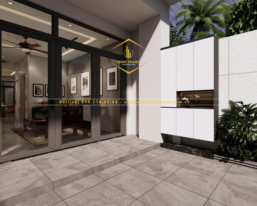 Khi nhìn vào hình phối cảnh, điểm ấn tượng đầu tiên chính là phần sân trước rộng thoáng, được thiết kế như một không gian thư giãn ngoài trời.