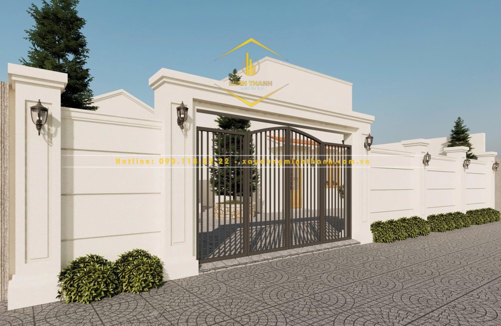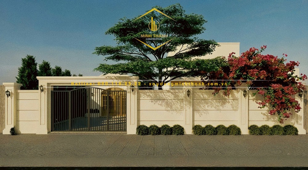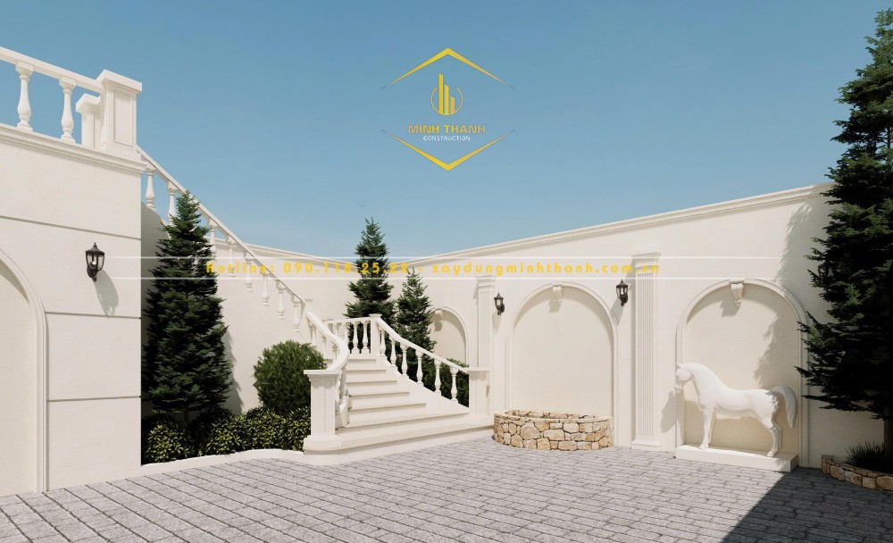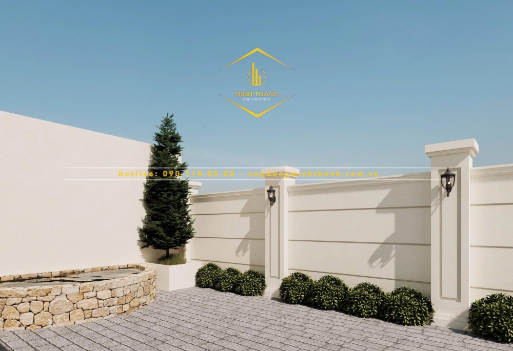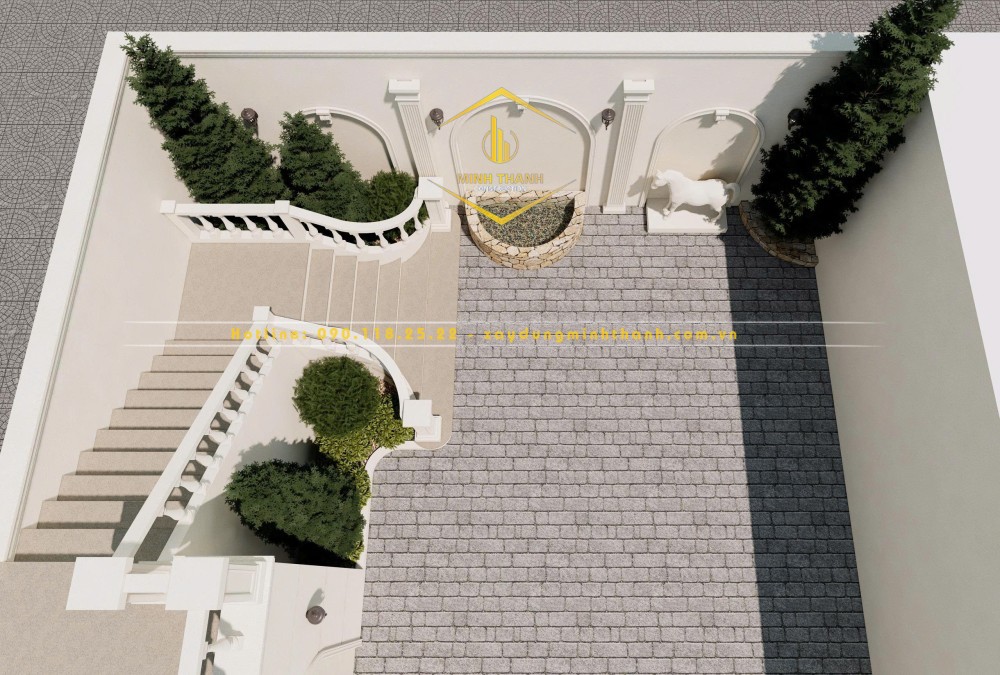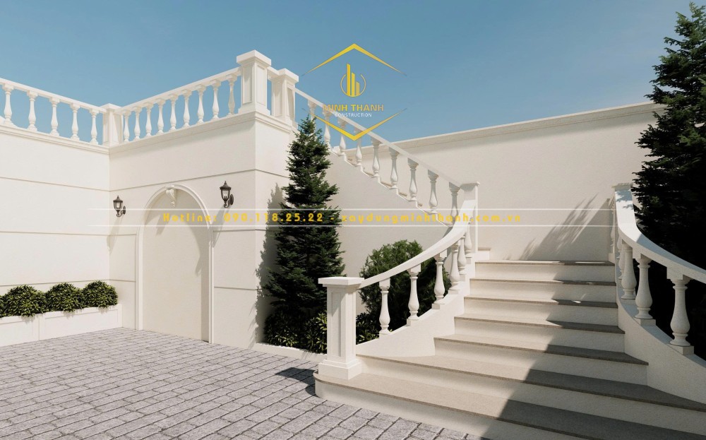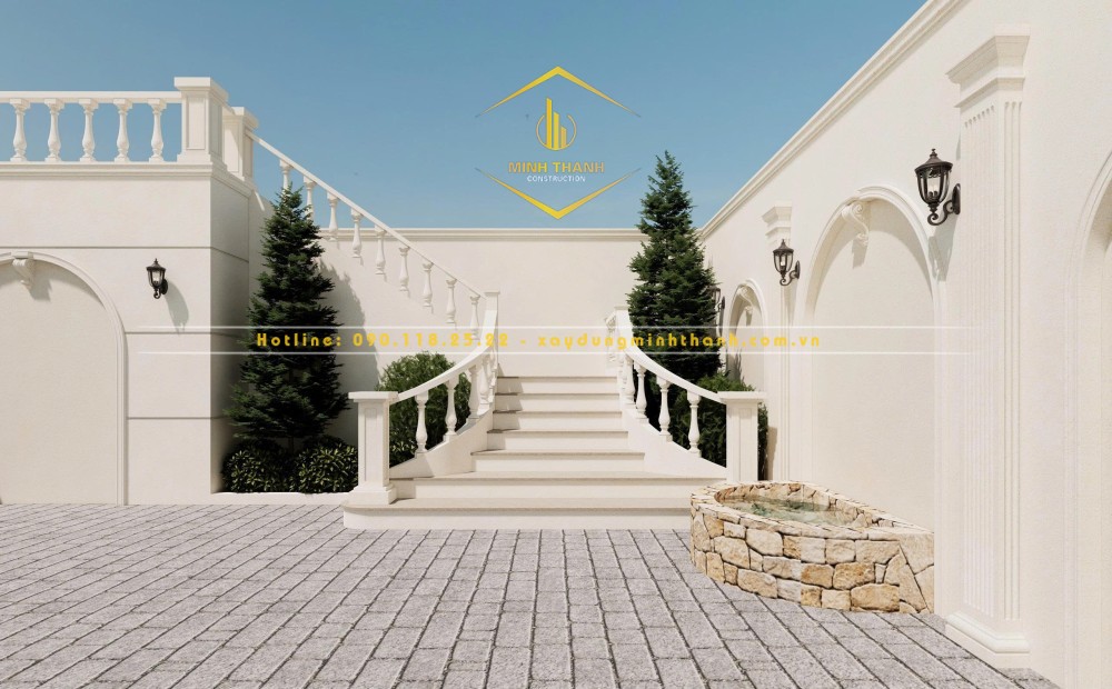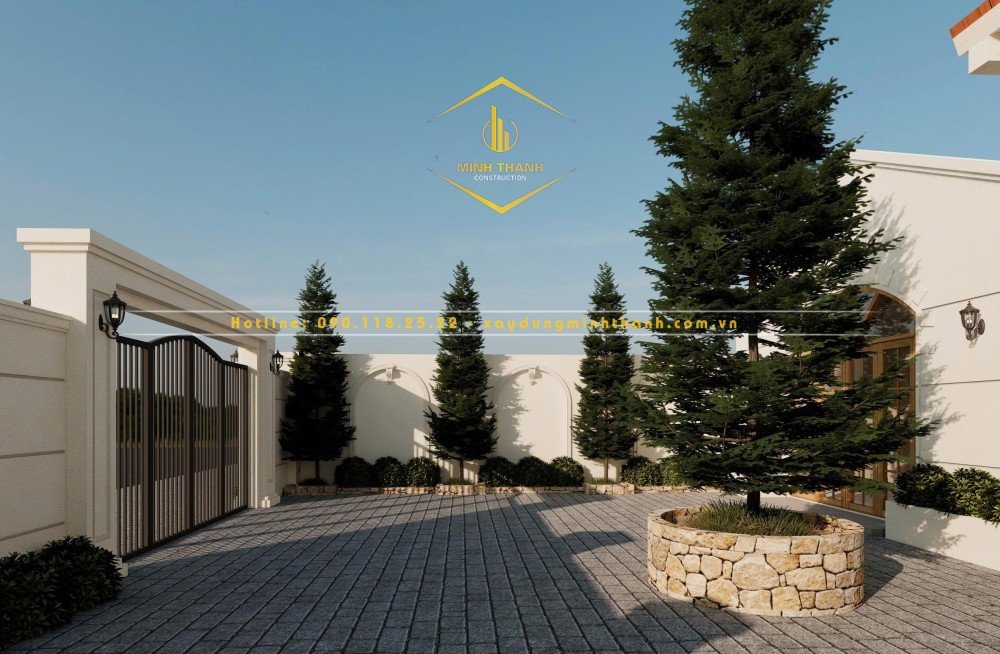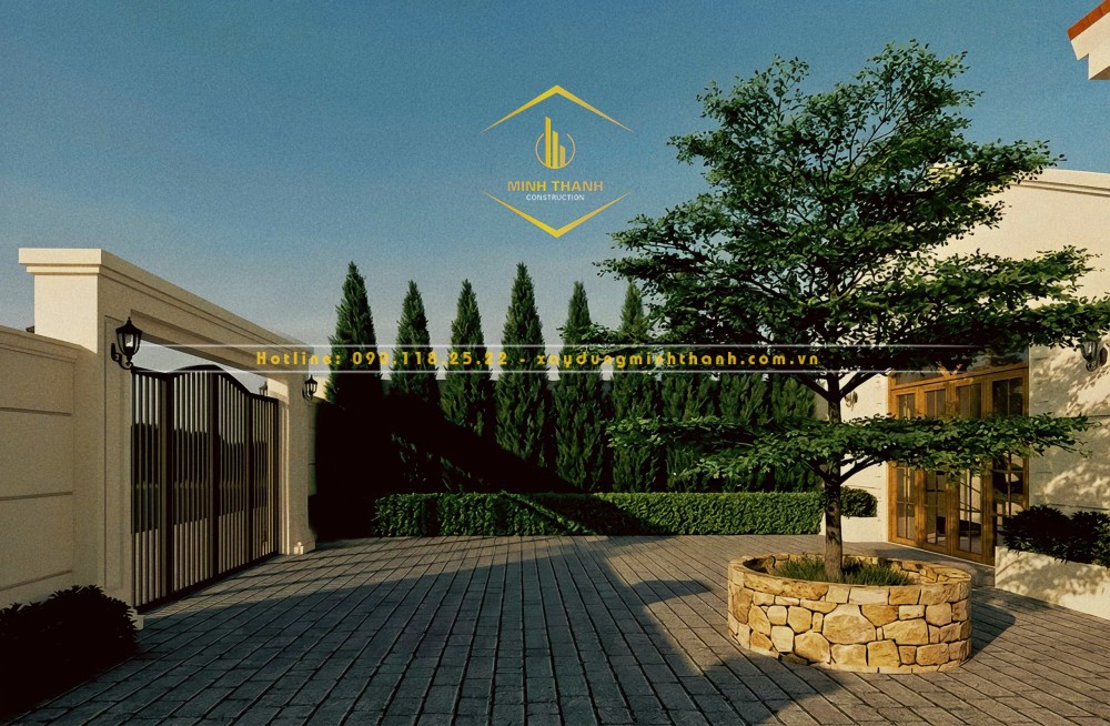 Sắt sơn tĩnh điện, đá lát ngoài trời và cây xanh được kết hợp hài hòa, vừa đảm bảo thẩm mỹ vừa tăng tuổi thọ công trình. Màu sắc chủ đạo là trắng – xám – xanh tự nhiên, mang đến cảm giác nhẹ nhàng, thư giãn và chuyên nghiệp.